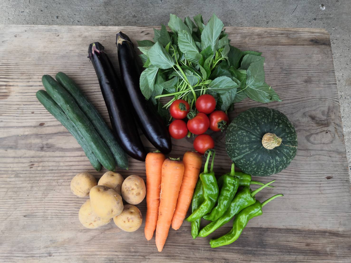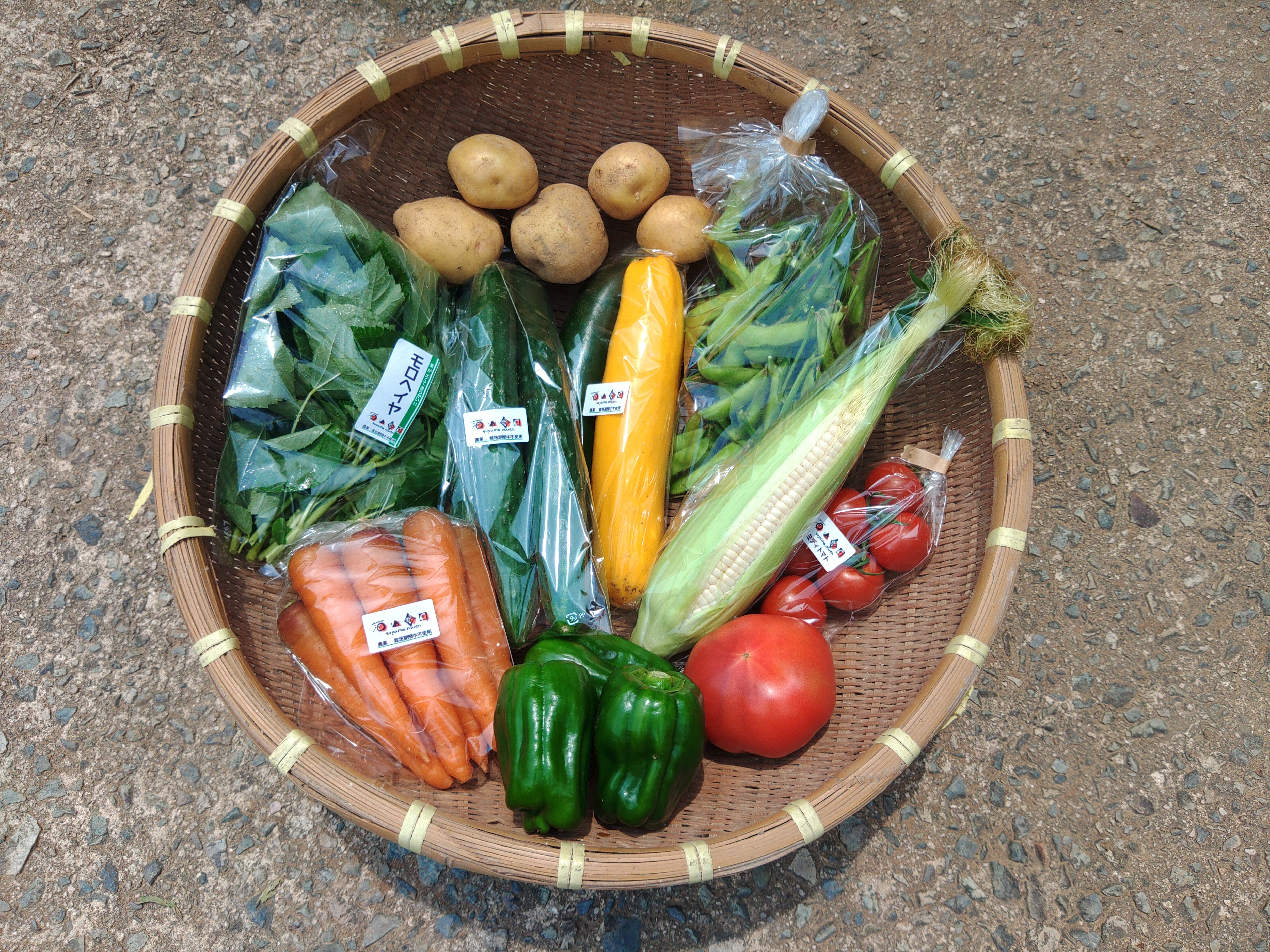 夏・・・ナス(3種類)、肉厚ピーマン、スイートコーン、シシトウ、ジャガイモ、ミディトマト、モロヘイヤ、キュウリ、オクラ