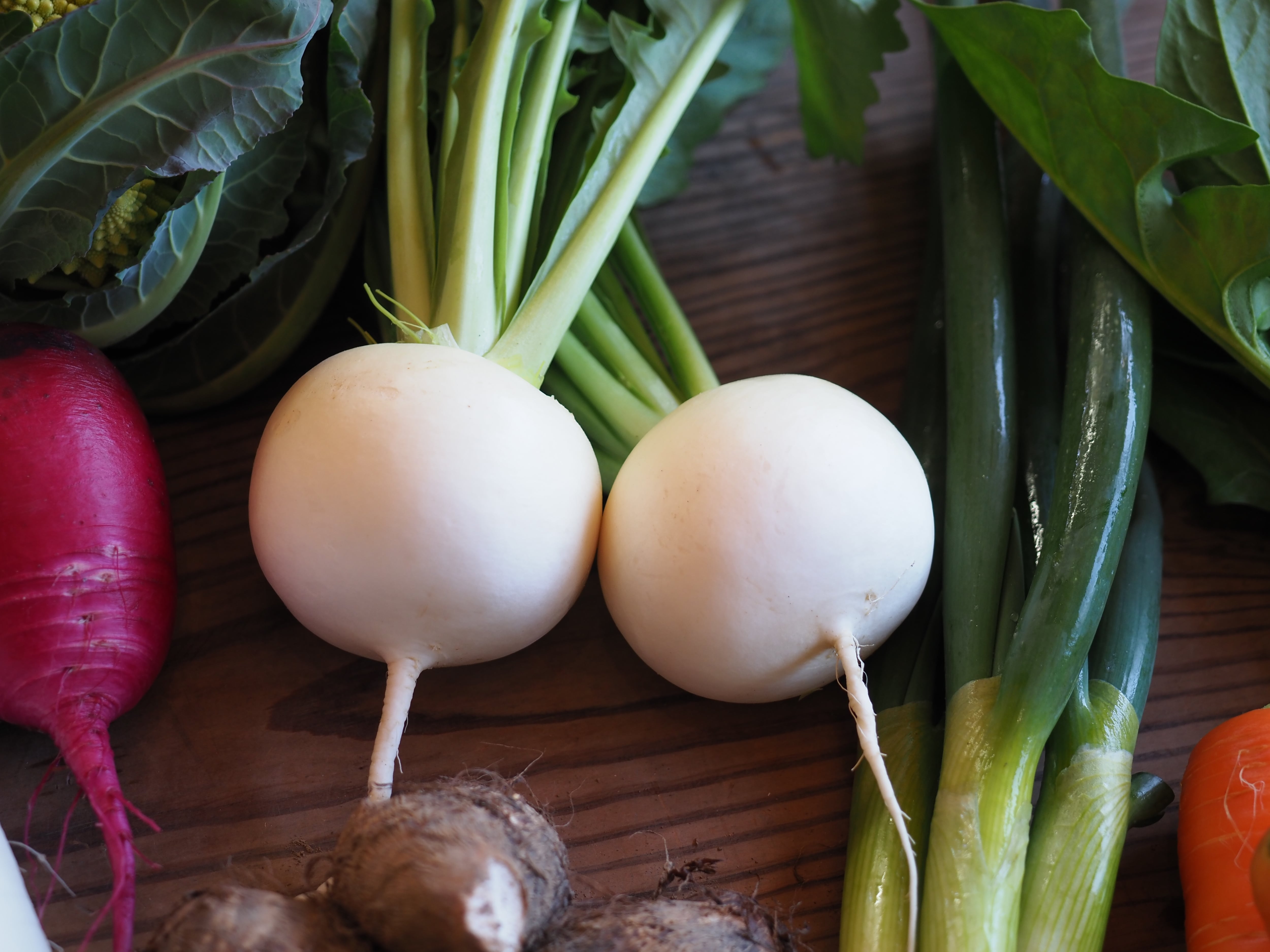 冬・・・おでん大根、人参、カリフラワー、サラダカブ、サラダ春菊、ほうれん草、白ネギ、里芋、ジャガイモ